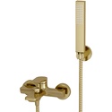 Керамический картридж 35мм, Sedal (Испания) Встроенный пластиковый аэратор Neoperl HONEYCOMB (Германия) для равномерного распределения струи Керамический поворотный переключатель Входит в комплект Лейка 1-функциональная с системой защиты от известковых отложений Шланг металлический 1500 мм, подключение к лейке Фиксированное настенное крепление для лейки Набор для монтажа Материалы Латунь, ABS-пластик, PVD-покрытие "матовое золото"